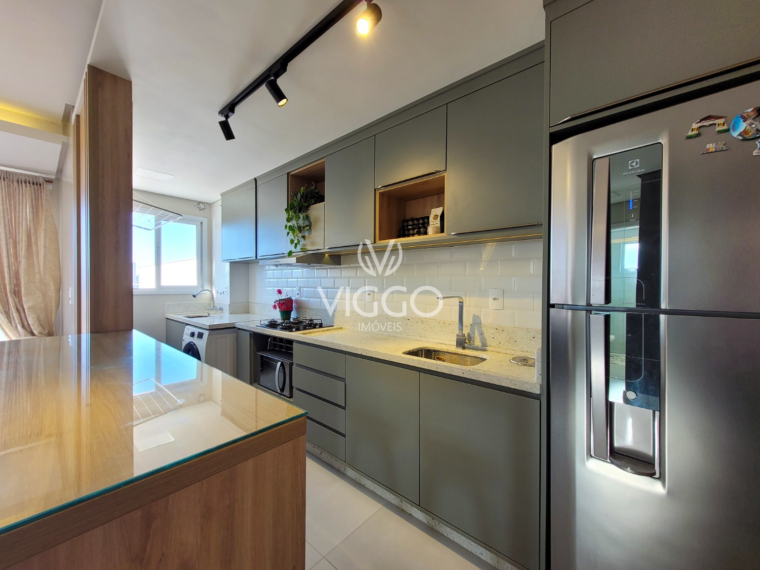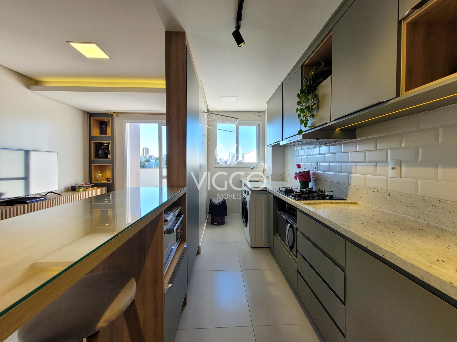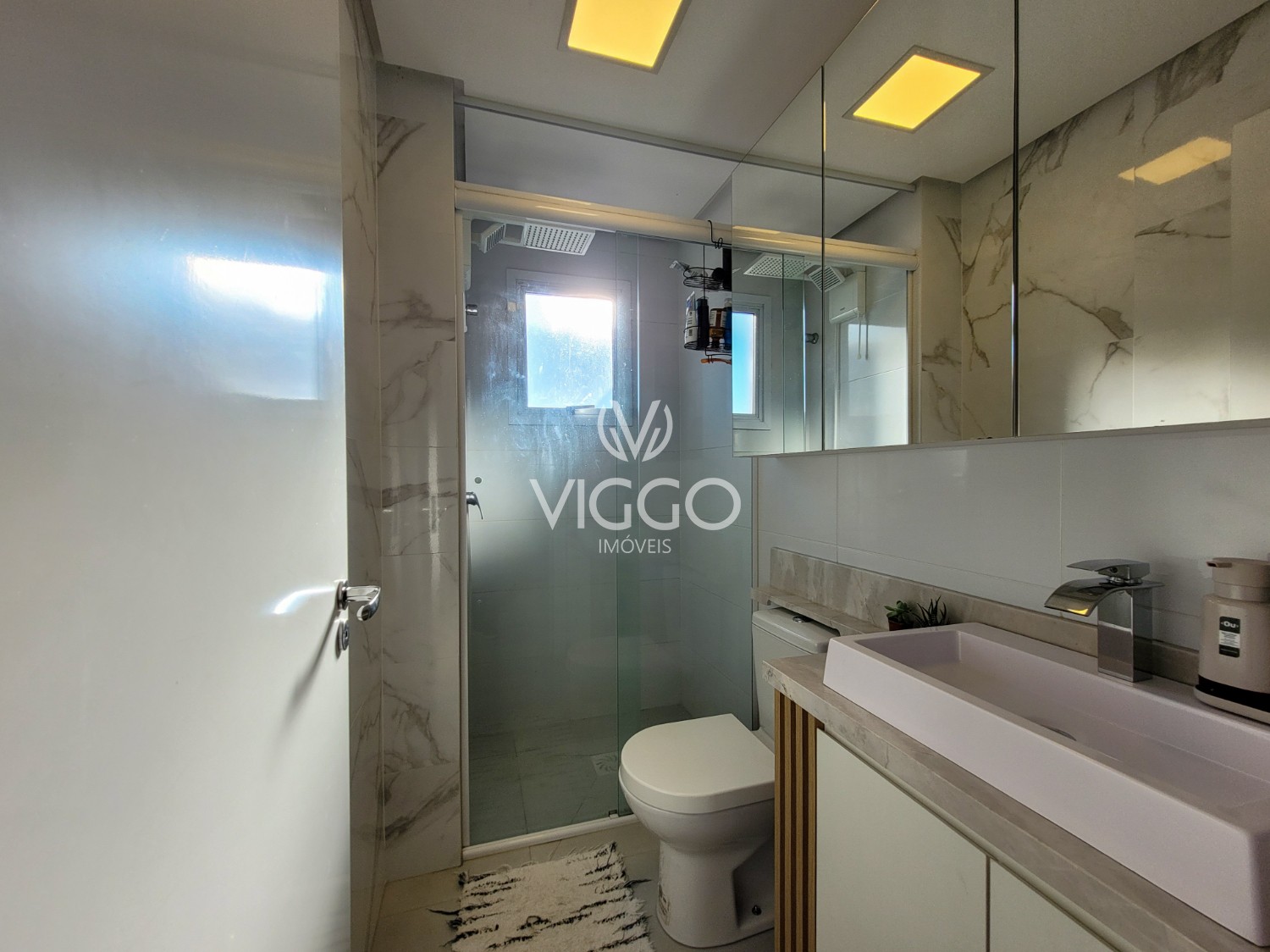 Móveis fixos em todos os cômodos, pedras em mármore, iluminação completa e torneiras;