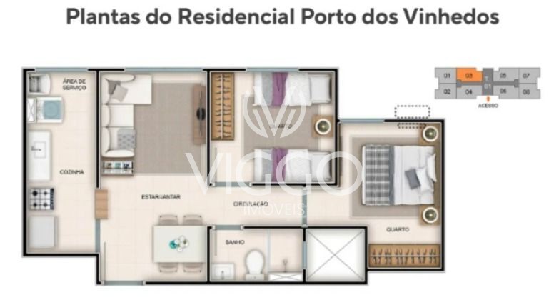 Condomínio completo com piscinas adulto e infantil, salão de festas, espaço gourmet, mini mercado, lavanderia, área verde com pomar.